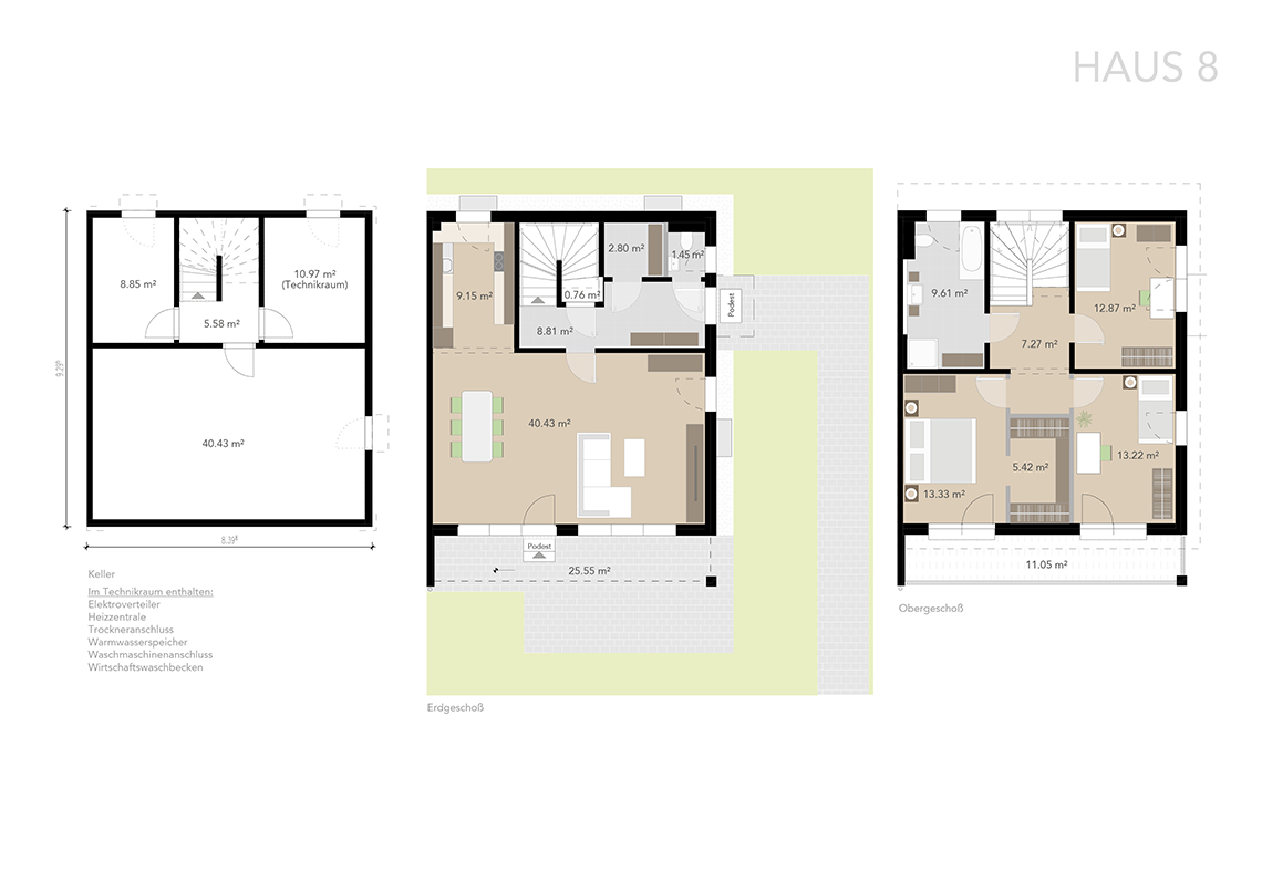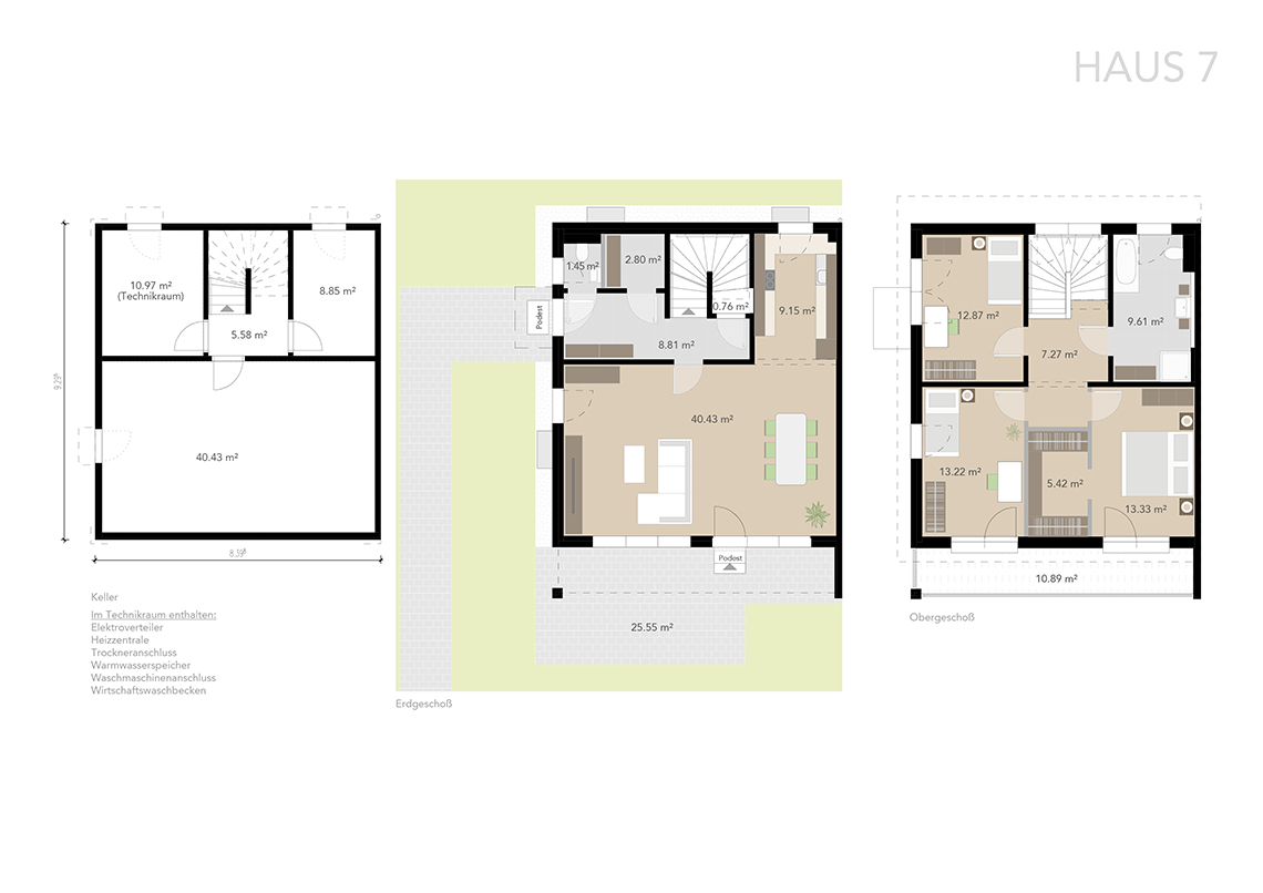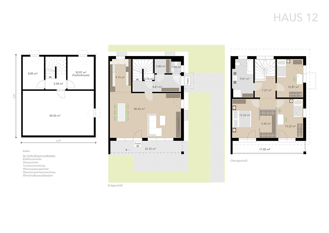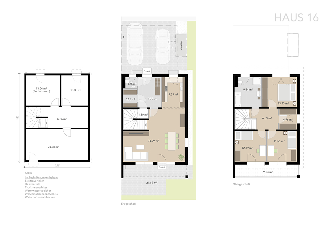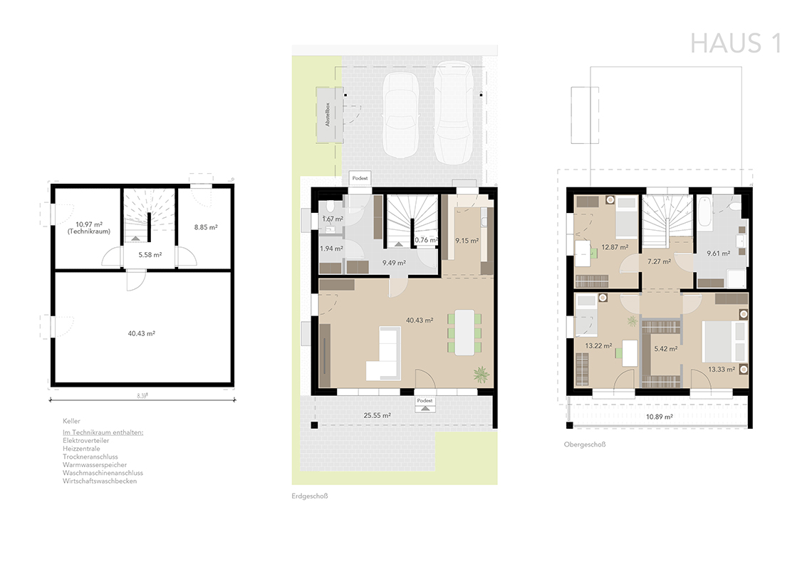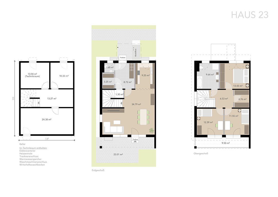 Die Häuser verfügen über ca. 117 bzw. 125 m² Wohnfläche im Erd- und Obergeschoss und sind zusätzlich voll unterkellert. Durch sorgfältige Planung wurde eine optimale Raumaufteilung erzielt.