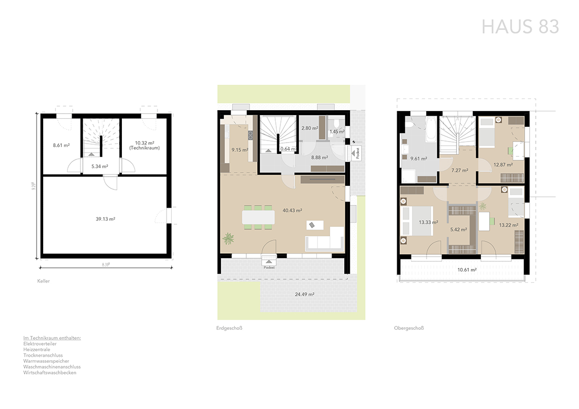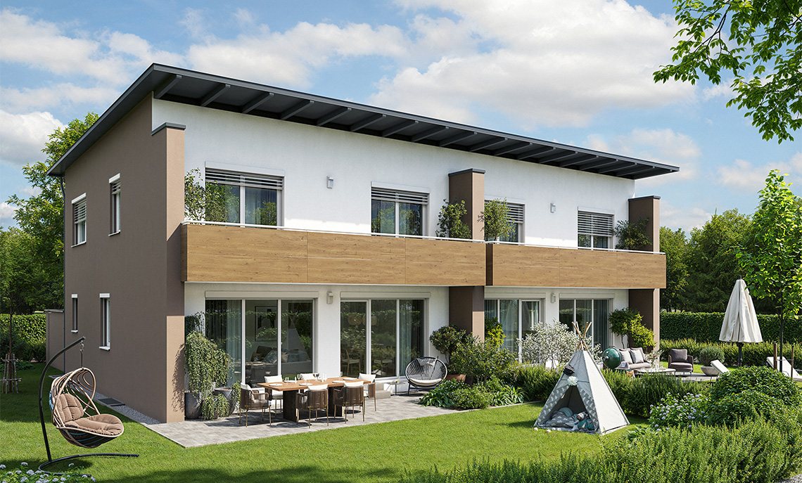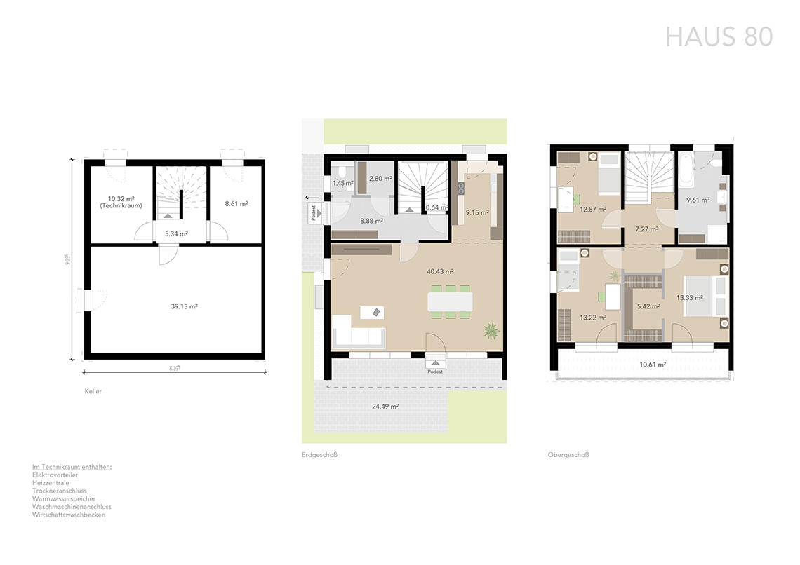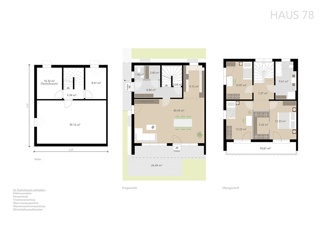 Die Häuser verfügen über ca. 125 m² Wohnfläche im Erd- und Obergeschoss und sind zusätzlich voll unterkellert. Durch sorgfältige Planung wurde eine optimale Raumaufteilung erzielt.